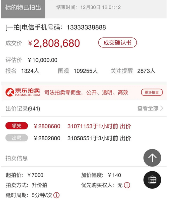 据了解该号码的拍卖时间为2020年12月29日12点。号码为13333338888的手机号在北京海淀法院司法拍卖平台进行拍卖,期初评估价为10000元,定为7000起拍。这次拍卖有1324人报名,据相关统计,此次号码拍卖的围观群众有109373人。次日,该号码为280.868万拍出。